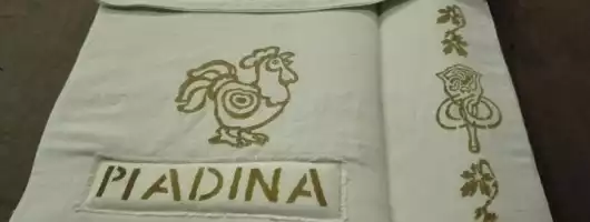 The wooden blocks are then soaked with printing dyes. This kind of printing is wash-resistant. The decorative patterns are either traditional symbols of Emilia Romagna’s rural world, such as the rooster, the “caveja” (the traditional wrought iron pivot with allegoric decorations, used to hold yokes in place), wheat spikes or grapes, or original floral or decorative motifs designed by the worskhop itself.