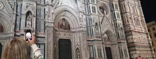 Continue your journey to Piazza Duomo. As the sun sets, the magnificent Cattedrale di Santa Maria del Fiore, with its iconic dome designed by Brunelleschi, takes on a magical glow. Your expert guide will share engaging stories and fascinating facts about the history, architecture, and secrets of this stunning cathedral. Stroll around the beautiful Piazza del Duomo, taking in the breathtaking facade of the cathedral, the Baptistery, and Giotto's Campanile, all beautifully lit against the night sky.